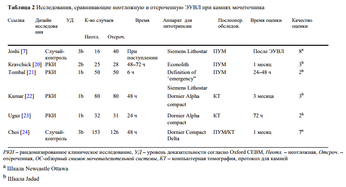 Для выявления публикаций, в которых изучались результаты неотложного или отсроченного лечения (либо ЭУВЛ, либо УРС) обструктивных камней мочеточника, с использованием нескольких поисковых систем (PubMed, Ovid и Scopus), был проведен систематизированный обзор литературы, опубликованной до июня 2016 года.